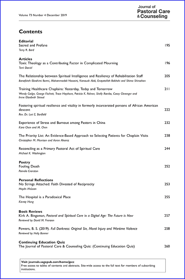 Journal of Pastoral Care Publications, Inc. The Journal of Pastoral Care & Counseling Vol. 71, No. 2, June 1, 2017 is now available online at jpcc.sagepub.com Members of JPCP Member Associations (ACPE, CASC/ACSS, CPSP, CSC, NAJC, and NIBIC) should access articles from the password protected section of their association websites. Here is the Table of Contents. Editorial: Fake Awareness by Terry R. Bard